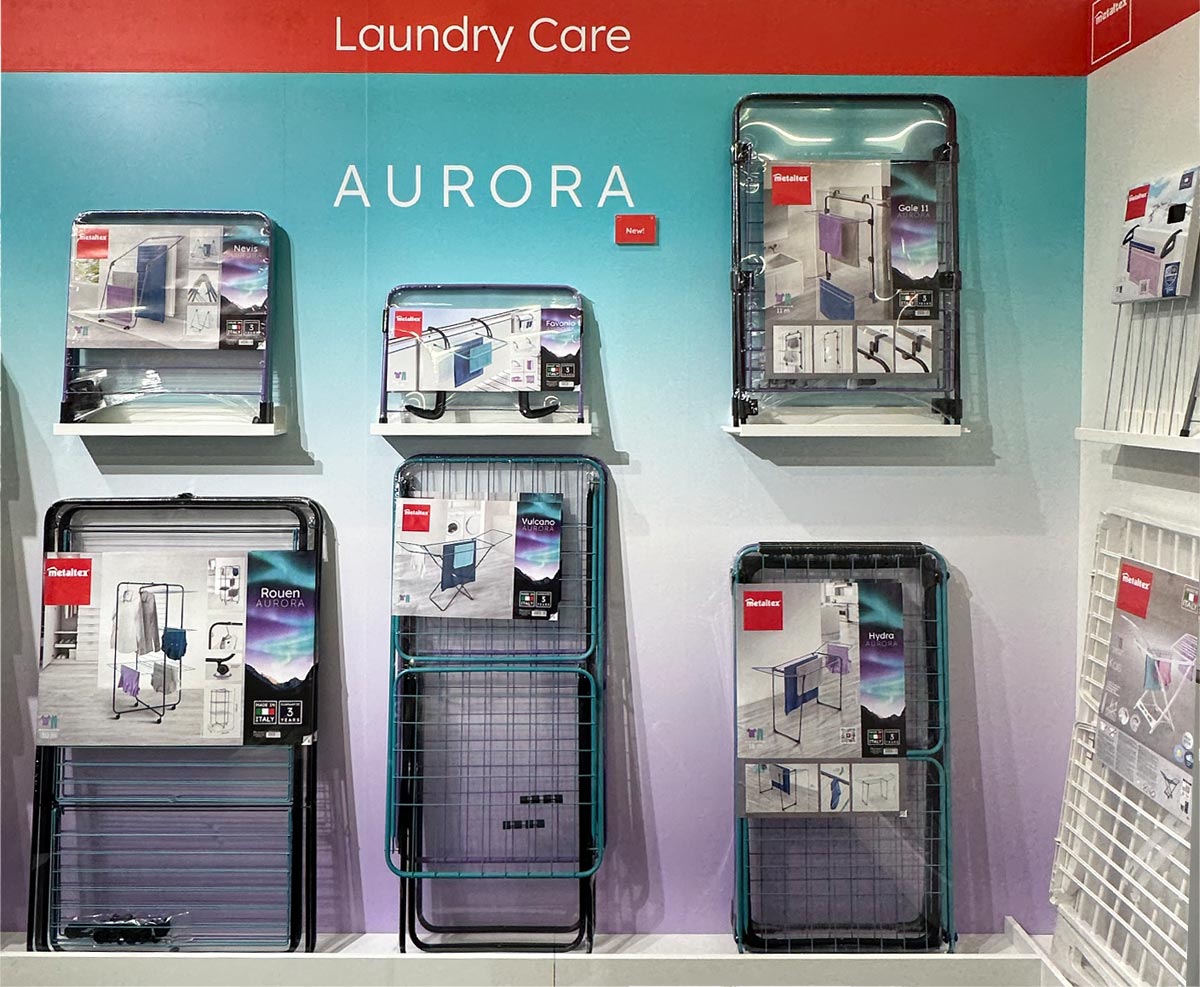 Nuestra gama de cuidado de la ropa se destacó este año con los secadores de ropa Aurora, cautivando al público con vibrantes tonos boreales (lila y aguamarina), combinados con patas en un atemporal negro mate. Estas incorporaciones muestran el compromiso de Metaltex de infundir artículos cotidianos con un toque de color y vitalidad.