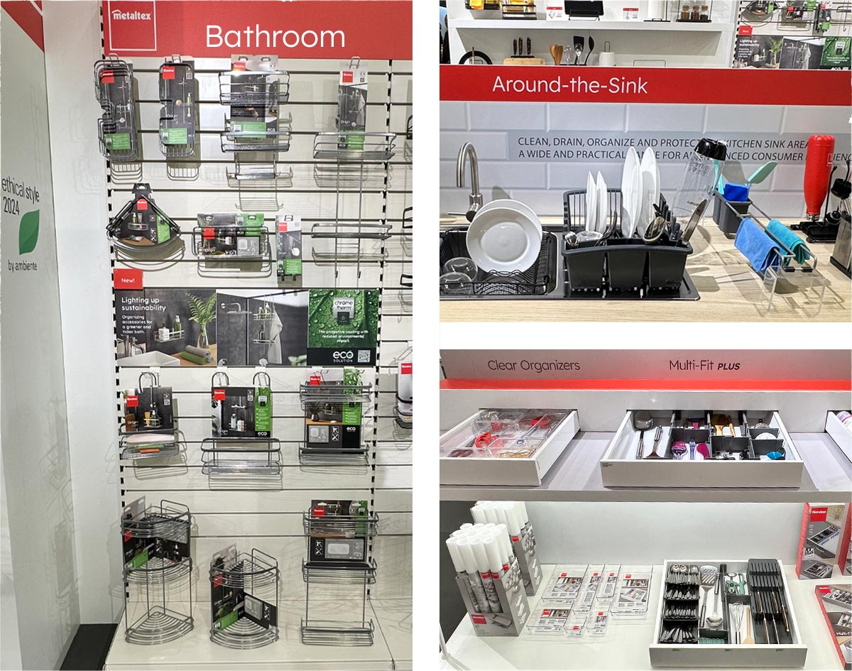 Para ampliar nuestra colección ‘Alrededor del Fregadero’, exhibimos una variedad de productos, incluido el versátil escurridor de platos Smartex, orgullosamente fabricado en Suiza. Además, presentamos varios accesorios nuevos de limpieza y organización diseñados para simplificar las tareas de orden en el hogar.