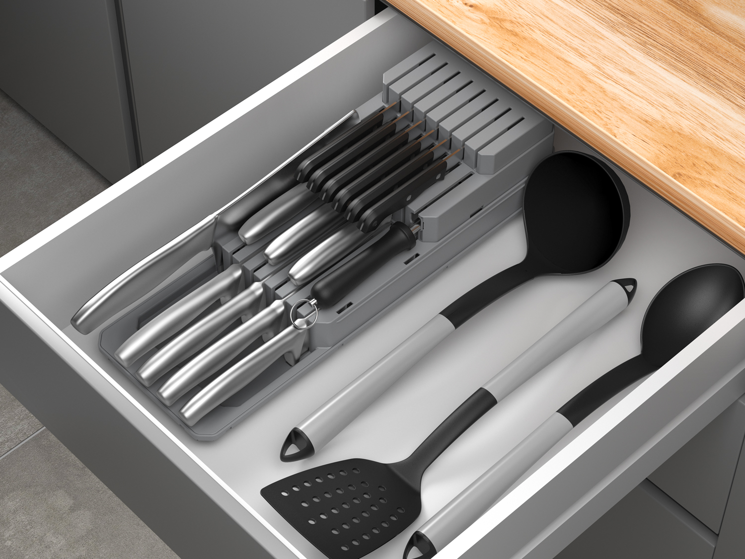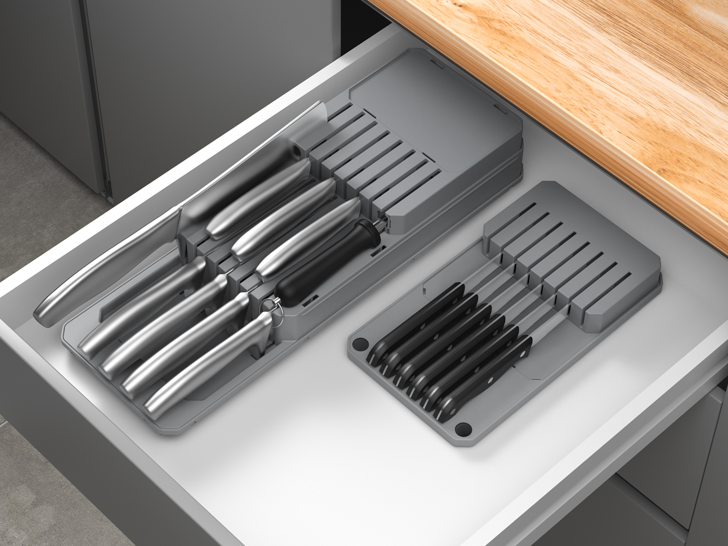 Introducing Blade-Fit, the ultimate customizable knife holder that is perfect for storing your knives safely in a drawer. With Blade-Fit, you can enjoy a tidy and spacious drawer thanks to its compact design that allows you to organize your knives according to your preferences.